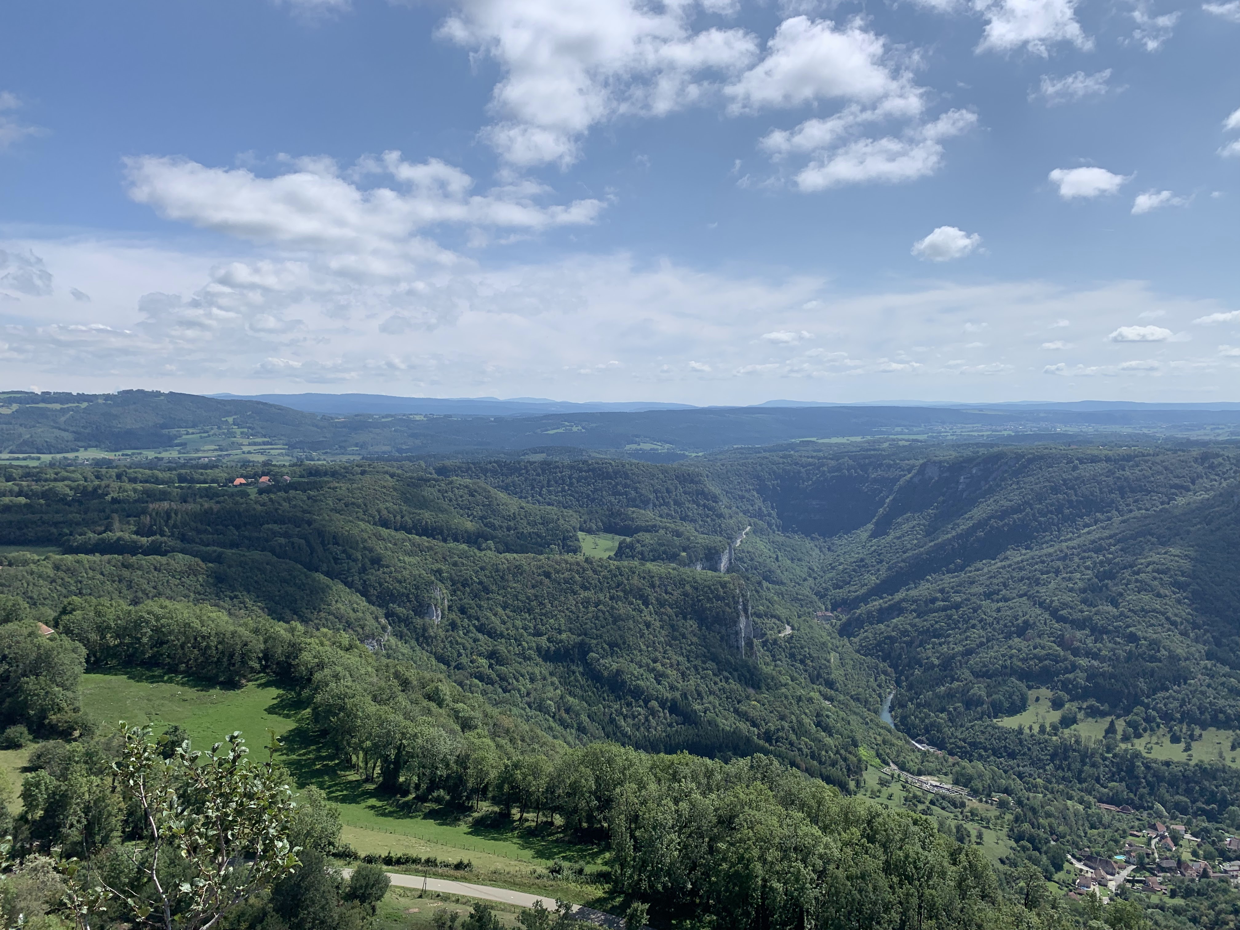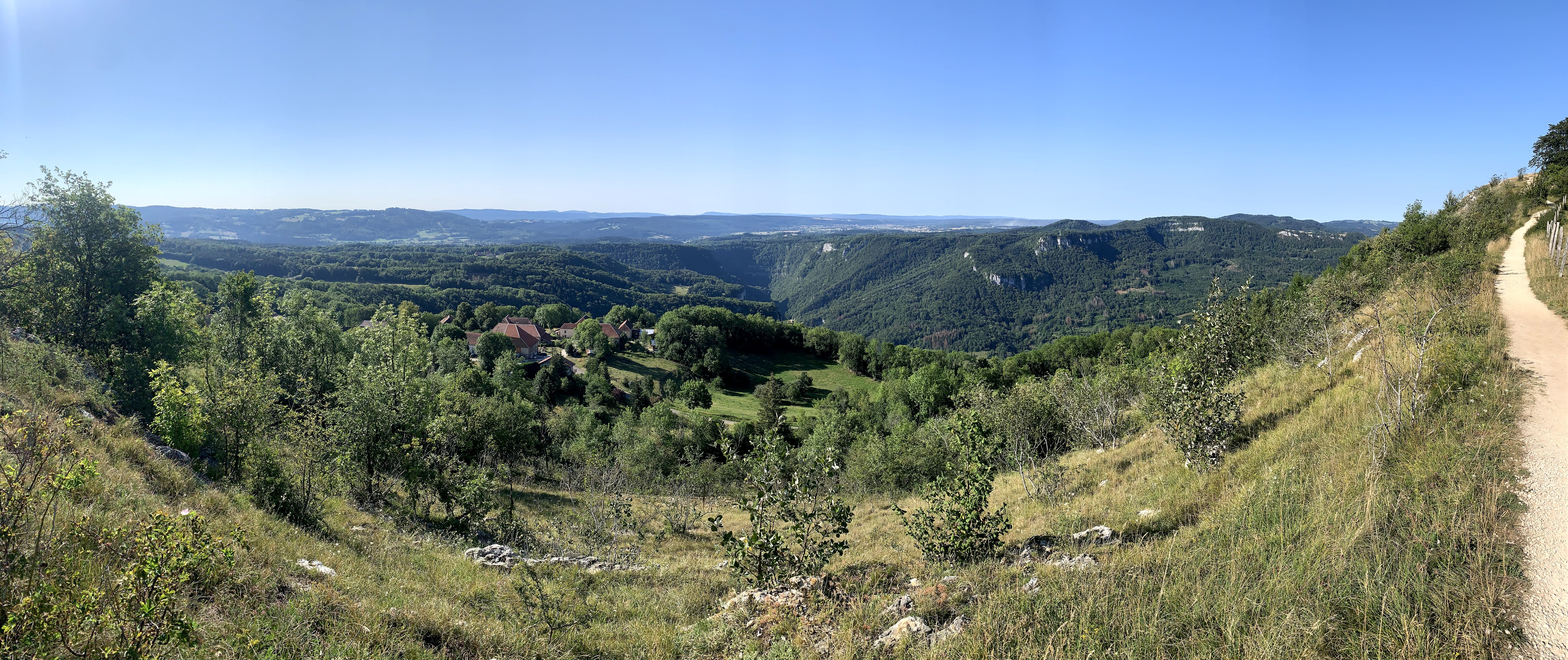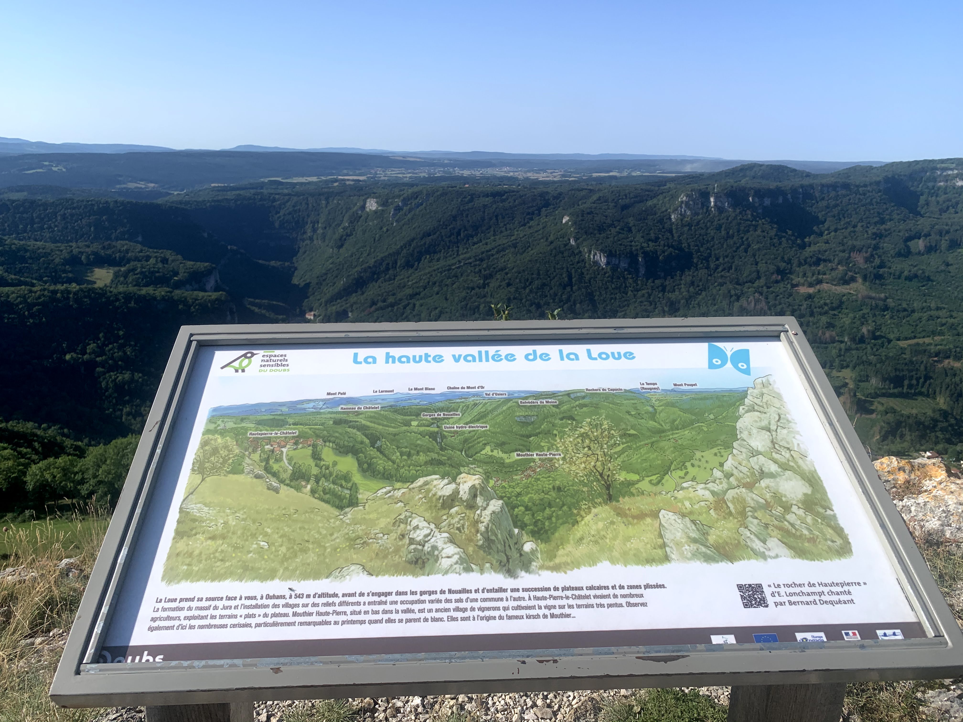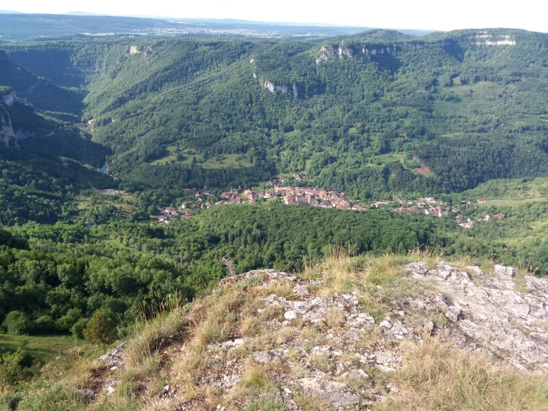 But de promenade mythique! Vue magnifique sur les Gorges de la Loue et ses falaises, les toits pittoresques du village de Mouthier, et plus loin le Mont Poupet ou à l'opposé le Chasseron et le Suchet. Quant au Mont-Blanc, il daigne parfois se montrer en fin de journée...